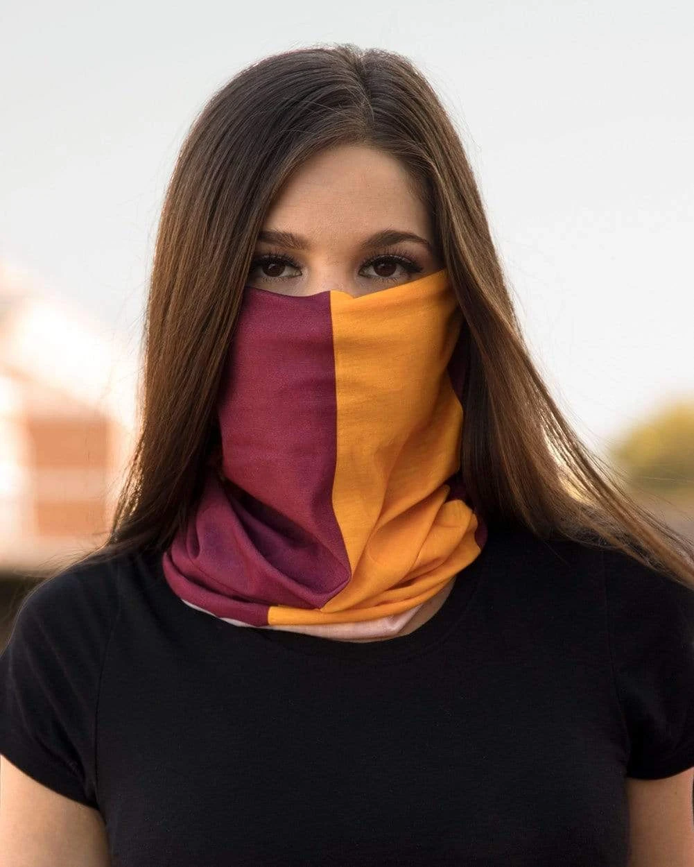The Burgundy and Gold Seamless Mask Bandana is a multi-functional face-covering that slides easily over your head to cover your neck, mouth, and nose. It can also be worn as a headband, wristband, hair tie, and more!