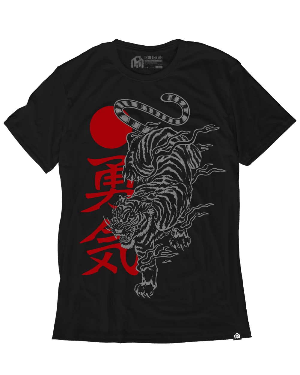 Roaming through the thicket of life’s distractions can make it difficult to lock in on your dreams. Achieving your goals requires perseverance, focus, and courage. So don our reflective Courage tee complete with the word in Japanese and channel your inner tiger.